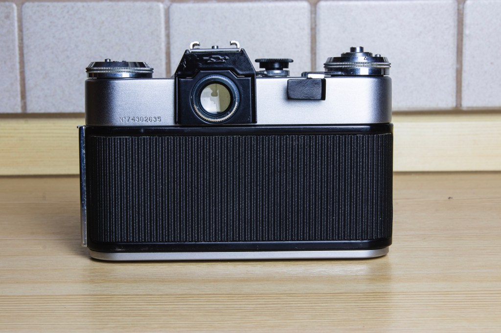Die Rückseite sieht recht karg aus. Nur die Klappe für das Filmfach, der Sucher und die Seriennummer. Die Seriennummer verrät zudem das Baujahr der Kamera. Meine Zenit E wurde 1974 gebaut, ist also schon 46 Jahre alt. Trotz des Alters funktioniert sie aber noch einwandfrei.