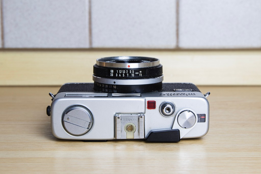 Vorne an der Kamera ist logischerweise das Objektiv (in diesem Fall ein fest verbautes Rokkor mit einer Brennweite von 38 mm und einer maximalen Offenblende von 2.7). Am Objektiv selbst befindet sich am unteren Rand die Einstellung des ASA-Wertes mit einer Range von 25 – 500. Oben am Objektiv ist der Sensor für den Belichtungsmesser angebracht. Somit muss man nicht viel nachdenken, wenn man einen Filter anbringt. Die Belichtungsmessung ändert sich automatisch je nach verwendetem Filter. Der Fokusring ist um das Objektiv gelegt. Der Einstellweg ist recht kurz, was schnelles Fokussieren ermöglicht. Es handelt sich natürlich um einen manuellen Fokus. Die Naheinstellgrenze liegt bei 0,8 m. Zudem ist ein Ring vorhanden, um die Blitzleitzahl einzustellen.