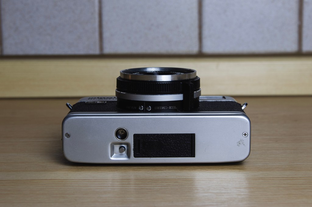 Die Minolta Hi-Matic F ist eine Messucher-Kamera aus dem Jahr 1972, die in einer sehr kompakten Bauweise daherkommt. Mit 113 x 73 x 54 mm ist sie klein, aber doch recht handlich, zumindest solange man keine Riesenhände hat. Und sie wiegt (ohne Batterien) nur 350g.