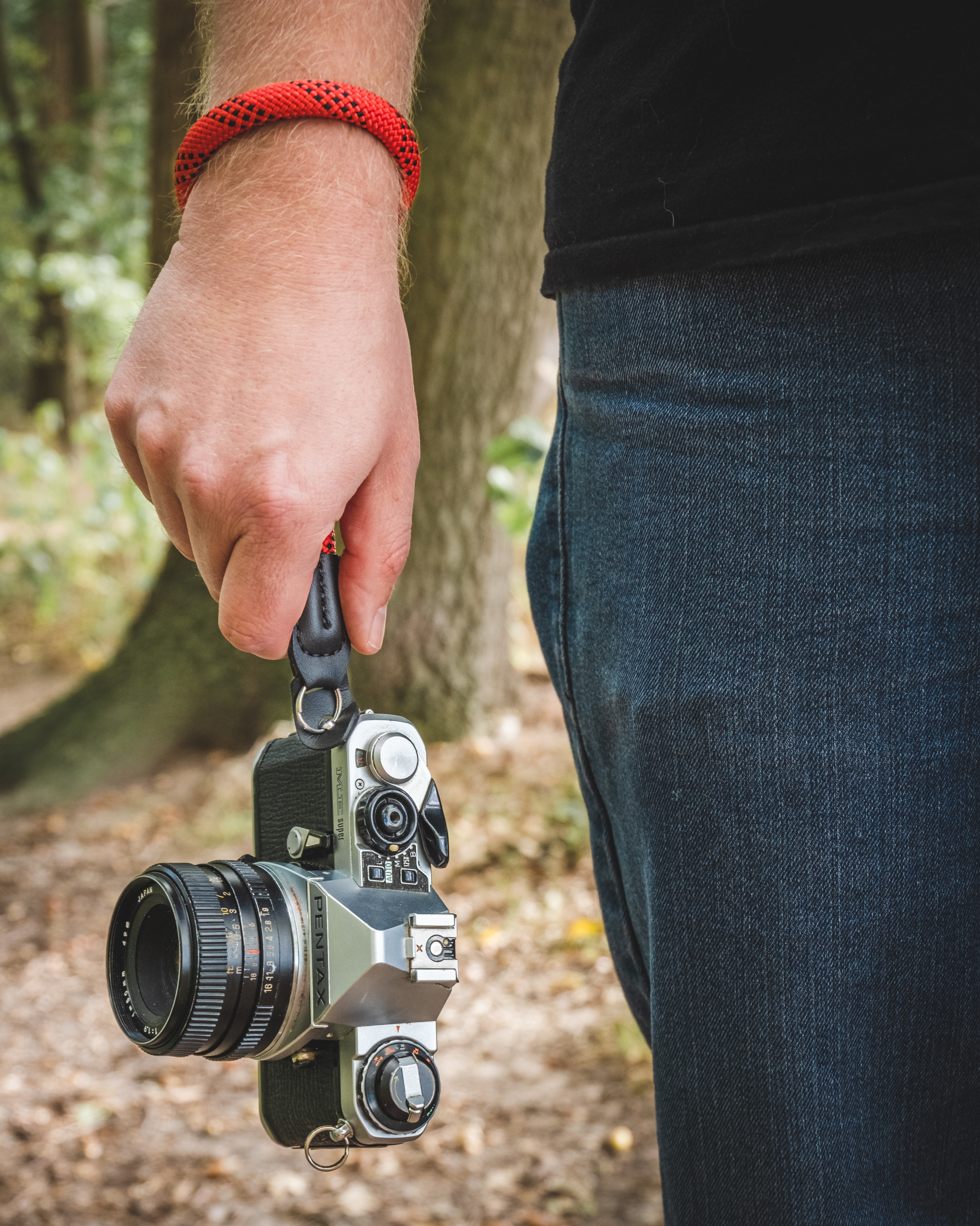 Bei der Handschlaufe von Lens Aid war ich zu Beginn auch skeptisch. Klar, sie ist wirklich dick und stabil und ja, sie lässt sich einfach an der Kamera anbringen und hat einen Kratzschutz aus Kunstleder. Aber… Wie sieht es mit dem Tragekomfort aus? Ist das Material kratzig? Reibt es vielleicht nach einiger Zeit? Die Pentax ME Super hat ohne Objektiv ein Gewicht von 445 g. Dazu kommen 166 g für das Auto Revuenon 50mm f/1.9. Somit hängen 611 g am Handgelenk. Klingt erstmal nicht viel, aber wenn man den ganzen Tag damit unterwegs ist, kann das schon unangenehm werden. Ich kann ganz klar Entwarnung geben. Das Material ist ein Nylon-Seil mit einer Länge von 25 cm und einem Durchmesser von 1 cm und es schmiegt sich sehr gut um das Handgelenk.